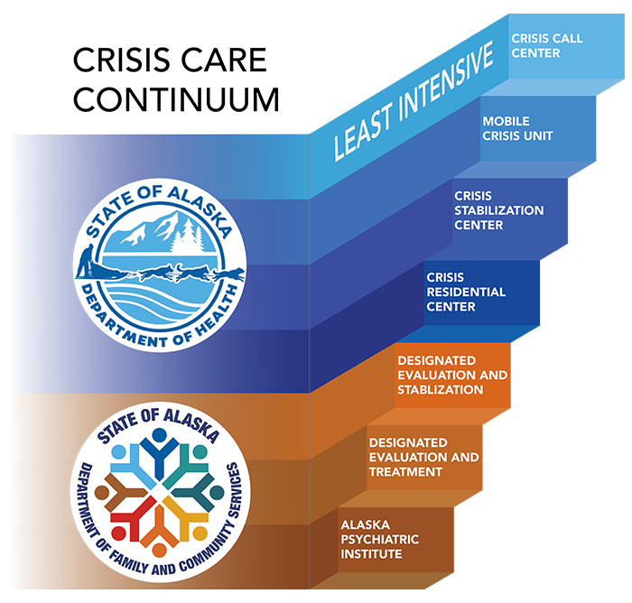The crisis care continuum is not a linear continuum. An individual may start anywhere along the continuum and a more intensive service is not necessarily the next step in addressing a mental health crisis. The least intensive service that an individual in Alaska can access is the 988 call center hotline. Individuals in crisis may call 988 and be connected with emergency mental health services, including suicide prevention. If needed, a mobile crisis unit may be sent out to the individual to assist with stabilization or connection to other resources. Currently, Alaska does not have a mobile crisis unit in every community, but more communities are planning on offering this service. The least intensive facility on this continuum is the crisis stabilization center which offers stabilization services that are less than 24 hours in length. If an individual needs to stay longer, but can be stabilized within 7 days, the crisis residential center is the facility to offer that service. The crisis residential center is meant to be an alternative to involuntary hospitalization, but can accept individuals on an involuntary commitment order for evaluation if the facility is designated. The services described in this paragraph are all administered by the Department of Health.
